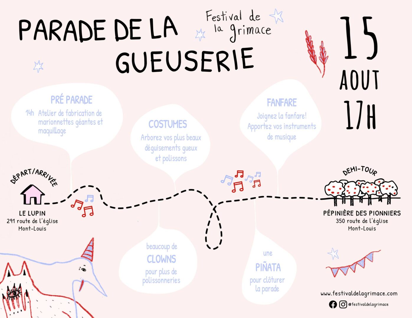 Here are more details about the festive parade that will kick off the festival. Bring your musical instruments, costumes, and your naughtiest accessories! Join us at 2 p.m. at the festival site for a moment of collective preparation: puppet making and face painting by artist Dylan Lafond.