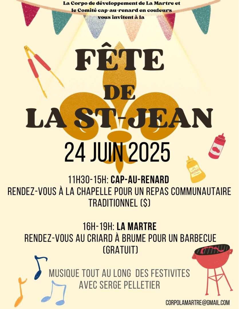 On June 24th, starting at 11:30 a.m., meet at the Cap-au-Renard chapel for the traditional St. John’s Day community meal ($), organized by the Cap-au-Renard en couleurs committee!