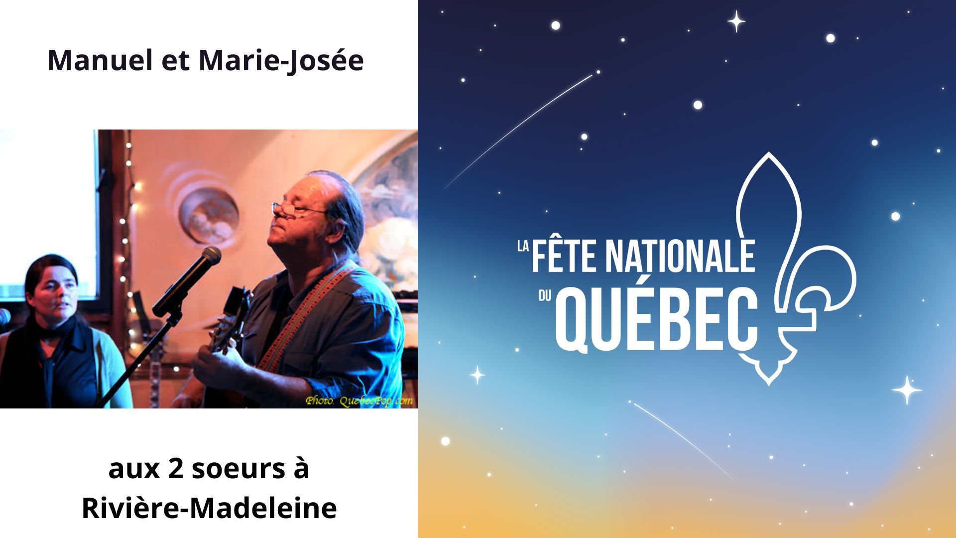 La capitainerie des 2 sœurs de Rivière Madeleine vous invite à venir célébrer la Saint-Jean en chantant des chansons de chez-nous avec la belle musique de Manuel et Marie-Josée dimanche et lundi le 23 et 24 juin 2024.