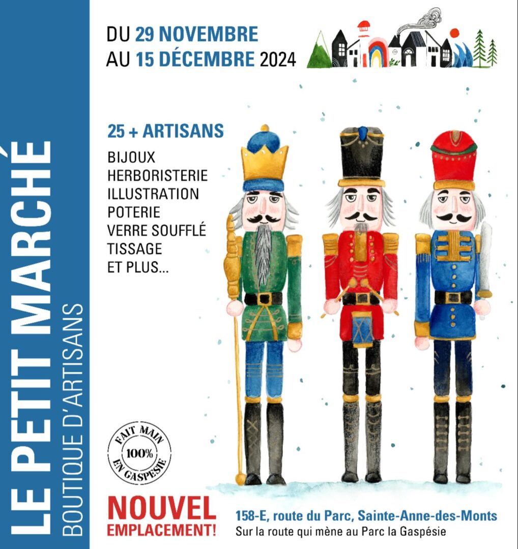 La magie de Noël prend place au Petit Marché du 29 novembre au 15 décembre. Découvrez les créations uniques de nos artisans et offrez pour Noël des cadeaux fabriqués ici, en Gaspésie.