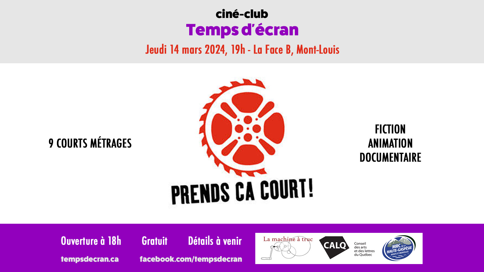 La projection sera divisée en deux blocs d’environ 1h, avec une pause. Les courts-métrages ont été sélectionnés par le programmateur Danny Lennon. Événement organisé en collaboration avec Prends ça court!.